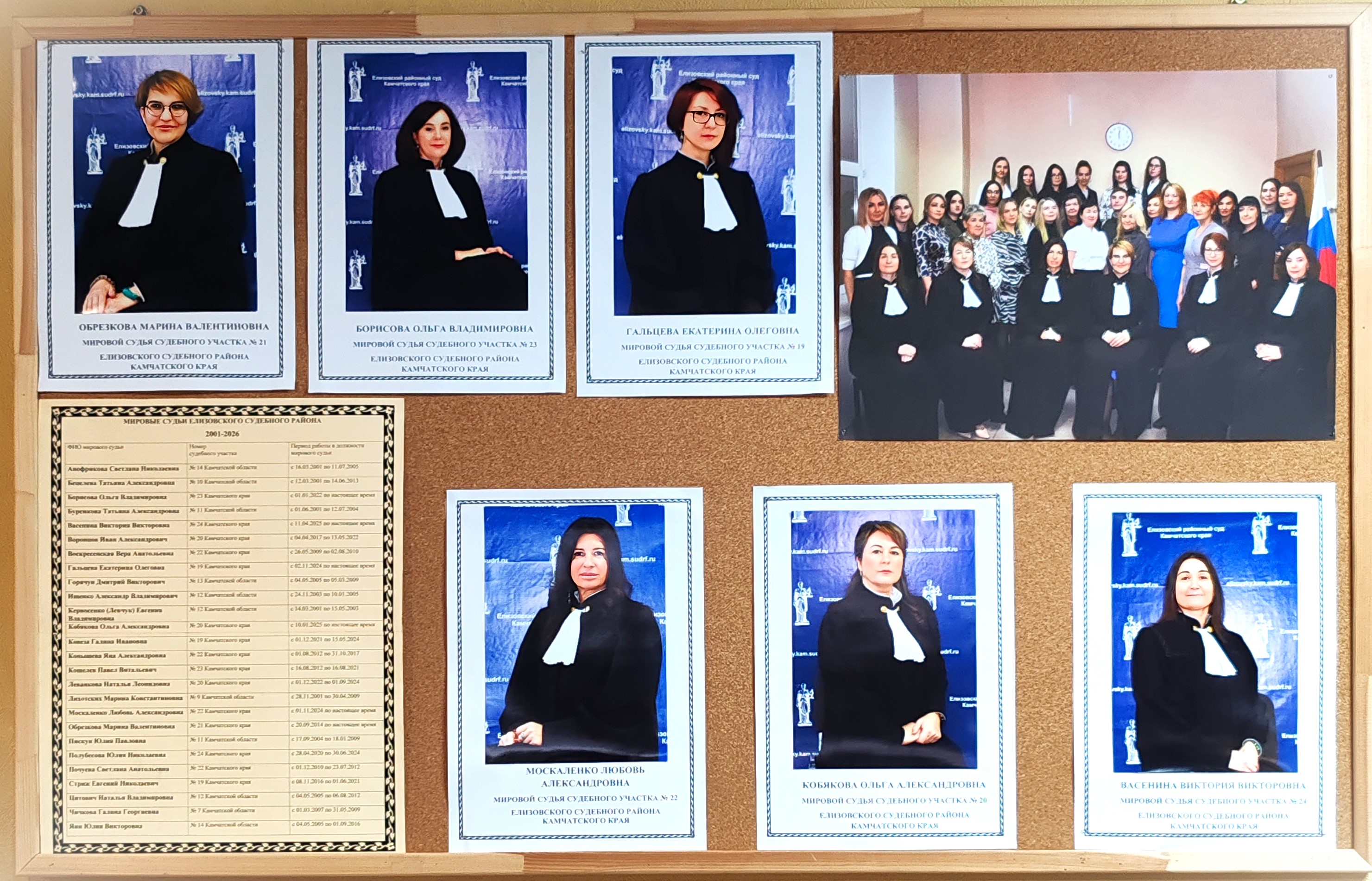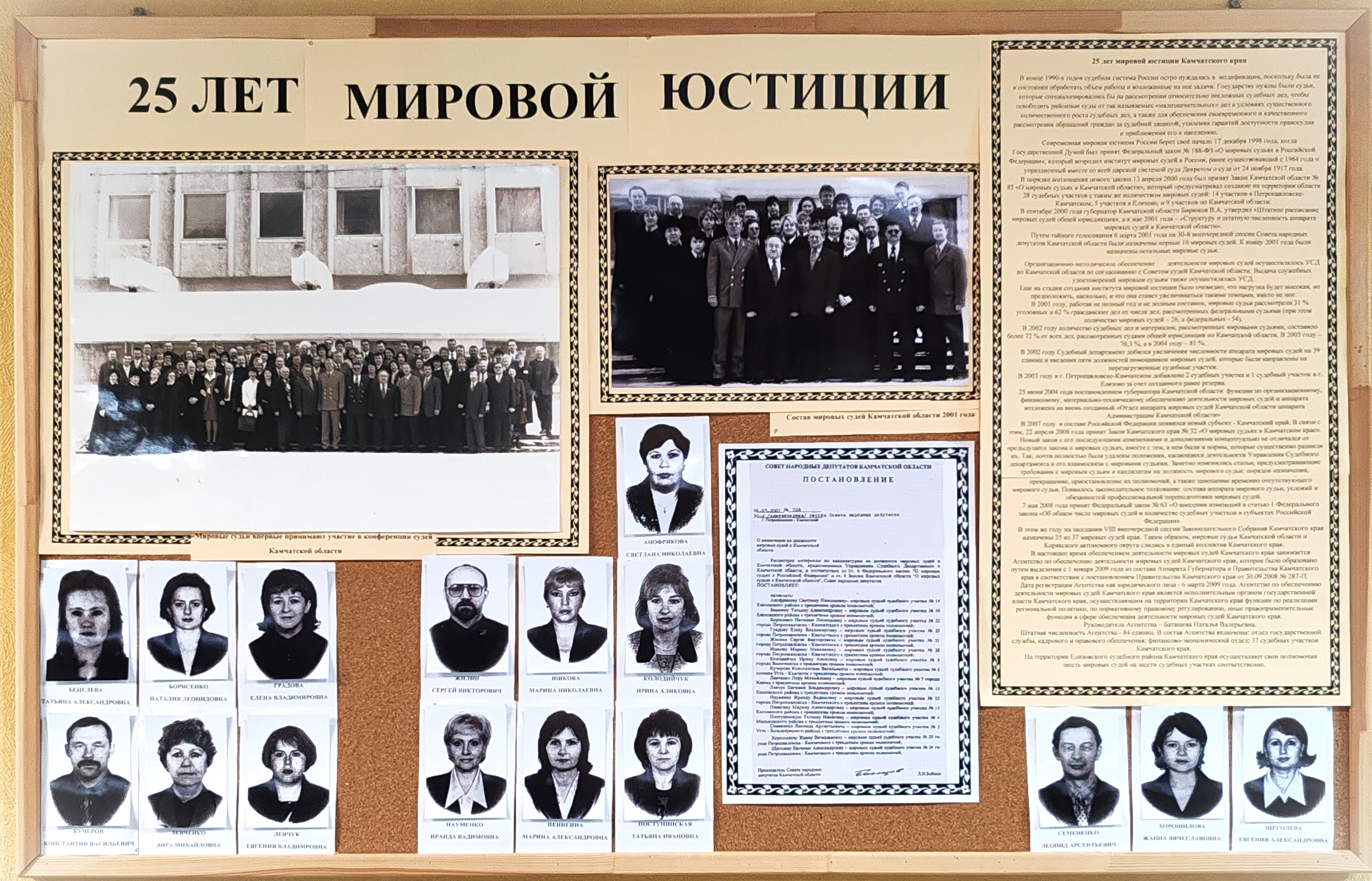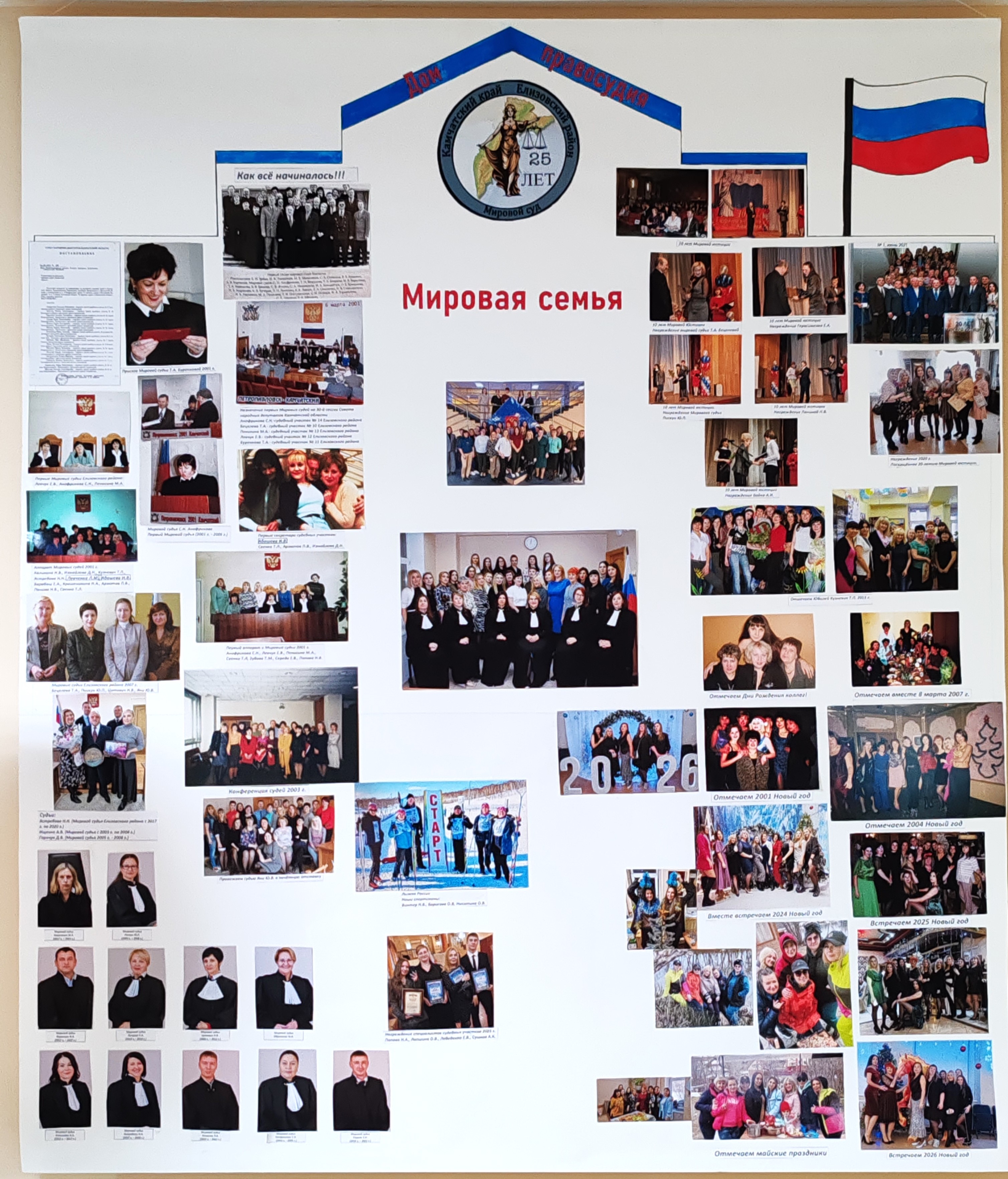 В рамках празднования 25-летия со дня образования мировой юстиции Камчатки судейским сообществом края проводятся различные мероприятия. Елизовский районный суд оформил и разместил в фойе здания суда информационный стенд, посвященный юбилею мировой юстиции. На стенде имеется информация об истории института мировой юстиции, её становлении на территории нашего края, в частности, размещена копия постановления Совета народных депутатов Камчатской области от 6 марта 2001 года о назначении первых шестнадцати мировых судей Камчатской области. На стенде размещены их фотографии. Также на стенде имеется список всех мировых судей, которые осуществляли правосудие на территории Елизовского судебного района с 2001 года по настоящее время, а также фотографии действующих мировых судей Елизовского судебного района. Сотрудники мировой юстиции изготовили плакат «Мировая семья», на которой разместили фотографии разных лет мировой юстиции Елизовского района.